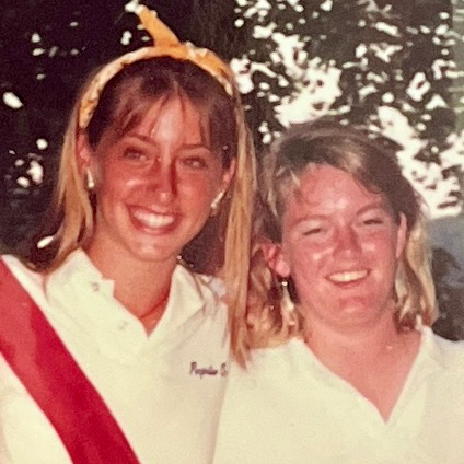 A vintage photo of two smiling campers at Camp Nakanawa, standing near Lake Aloaloa. Shelly Duer, the Amazon War Canoe cox, sports a painted “A” on her forehead—marking the beginning of a beloved camp tradition.